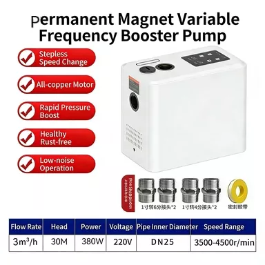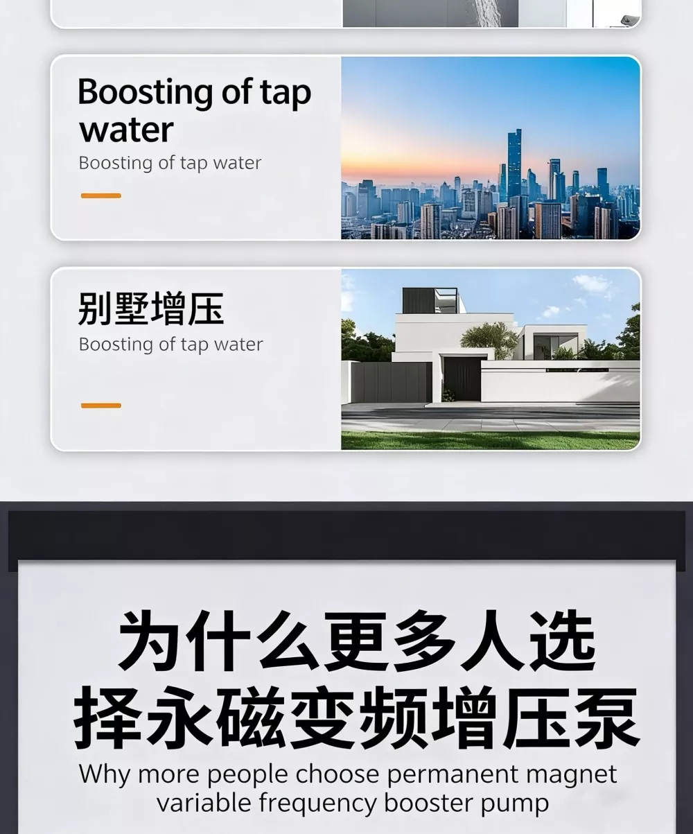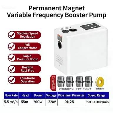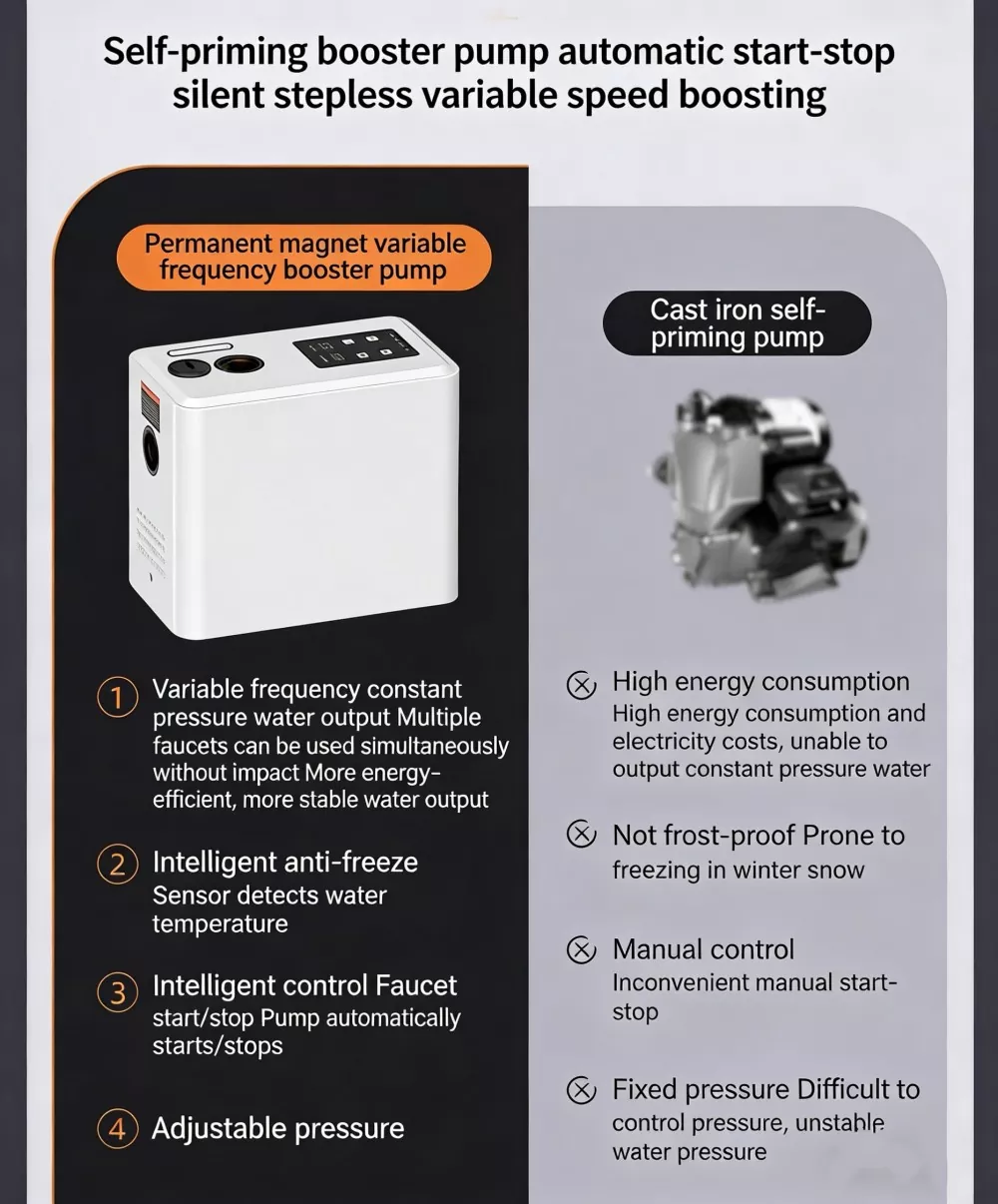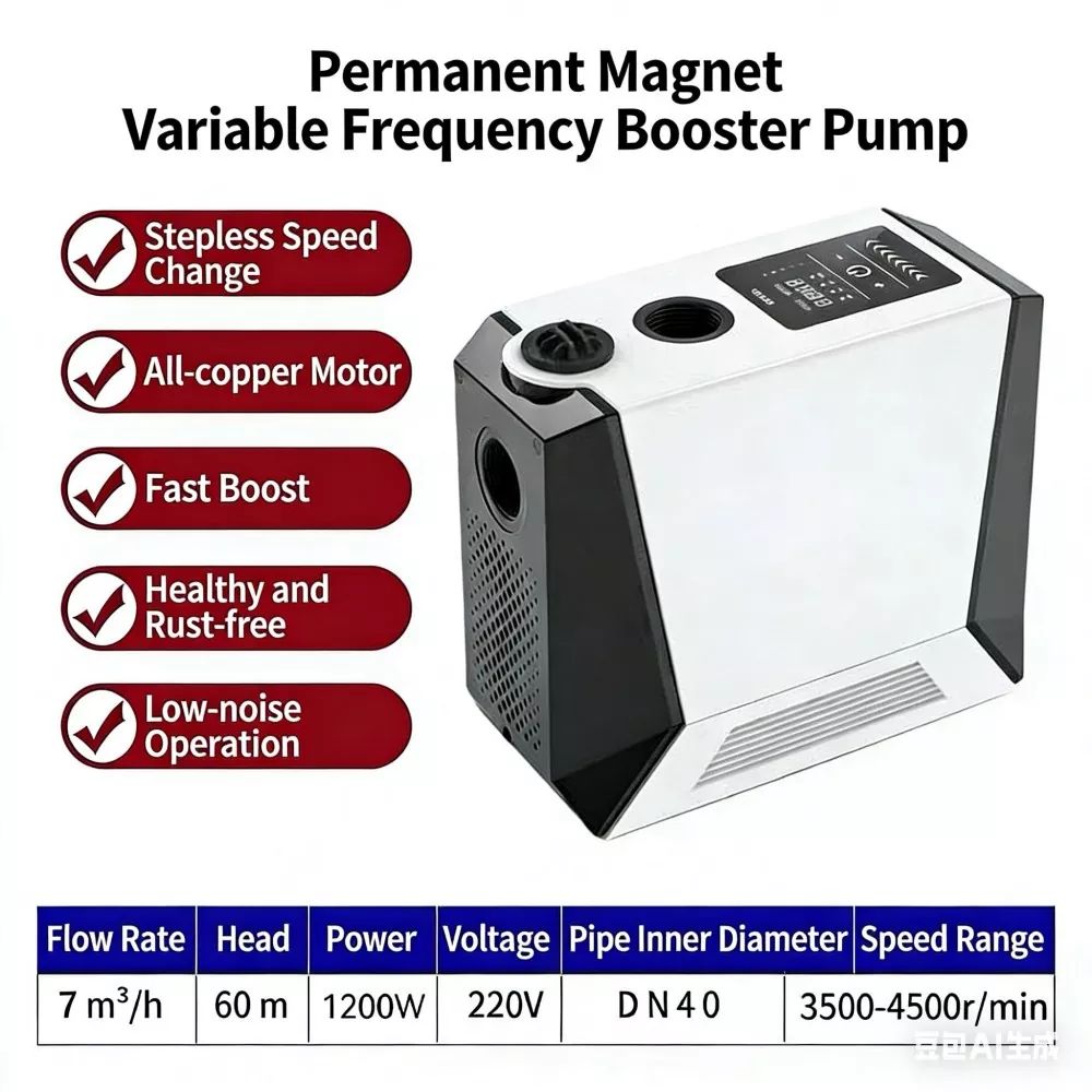 Cuando busca una solución de alta calidad para aumentar la presión del agua en el hogar, la bomba elevadora de frecuencia variable de imán permanente es su mejor opción. En comparación con las bombas de refuerzo ordinarias del mercado, nuestro producto está equipado con un sistema de control totalmente inteligente, una función estable de presión constante de frecuencia variable, un diseño de funcionamiento con ruido ultrabajo, un motor de alta velocidad y alta potencia, una protección anticongelante inteligente y una apariencia elegante y compacta. Resuelve perfectamente las deficiencias comunes de las bombas tradicionales, como la operación manual engorrosa, la presión del agua inestable, el alto ruido de funcionamiento, el fácil daño por congelamiento en invierno y la instalación voluminosa y difícil.