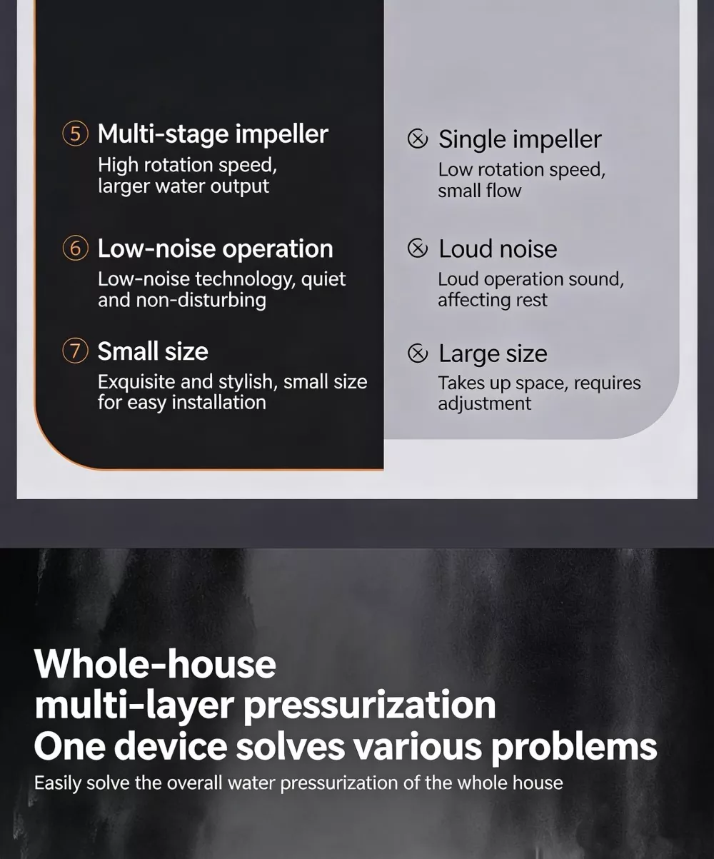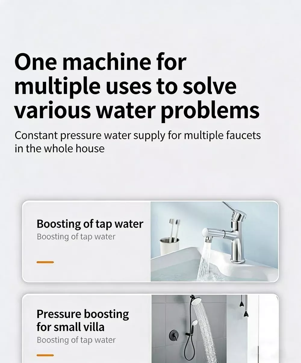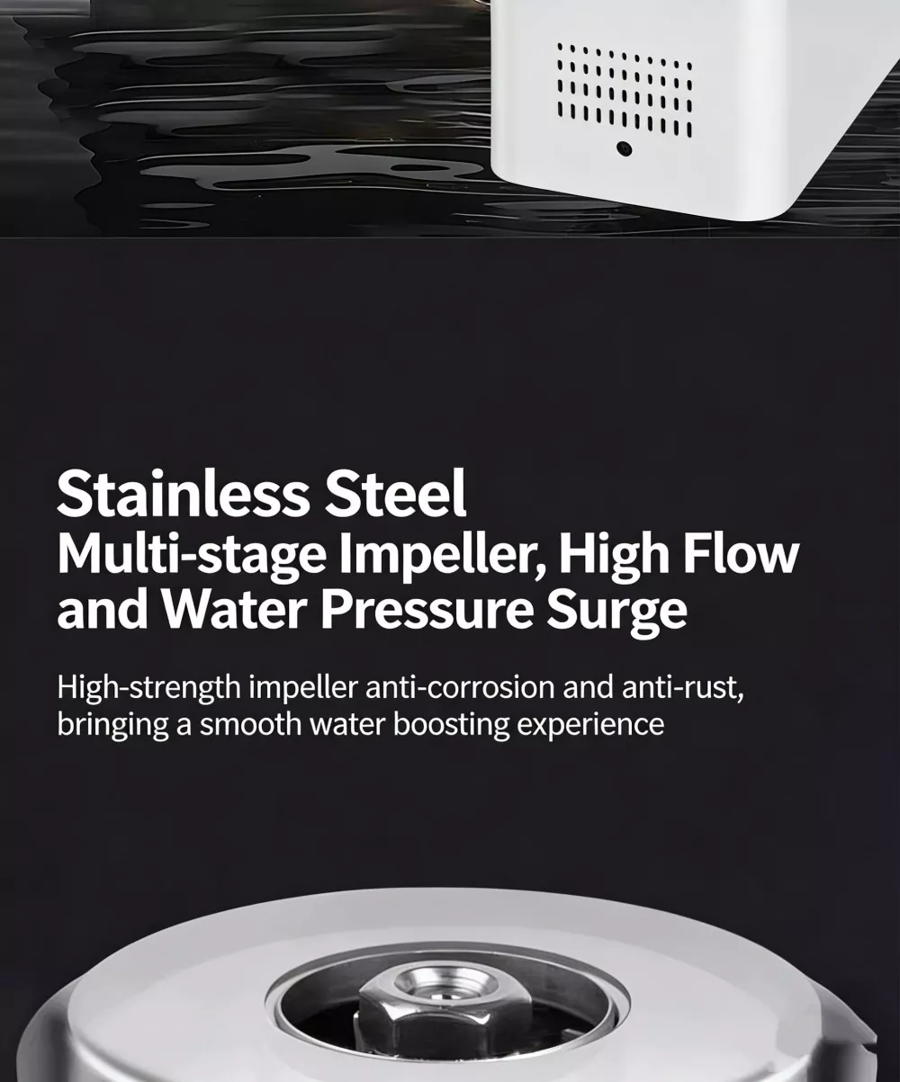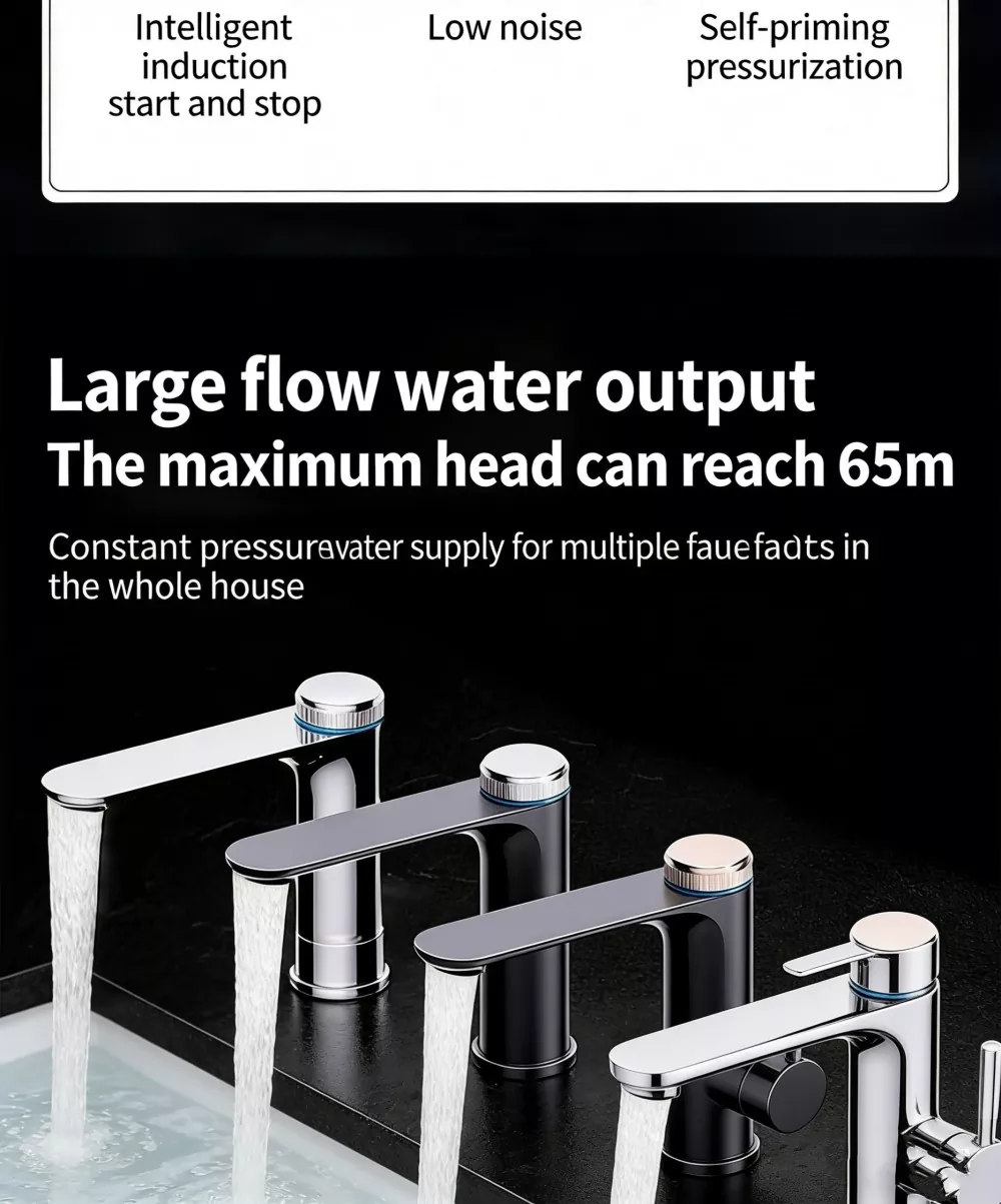 Motor de alta velocidad: el motor de alta velocidad incorporado de 6500 RPM brinda potencia creciente, ofrece una salida de agua de gran flujo fuerte y estable y resuelve completamente el problema de la presión insuficiente del agua en el hogar.