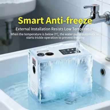 Anticongelante inteligente: con un sistema inteligente de detección de temperatura, funciona automáticamente a baja velocidad cuando la temperatura ambiente es inferior a 3 ℃, evitando eficazmente que el cuerpo de la bomba y las tuberías de agua se congelen y agrieten en climas fríos.